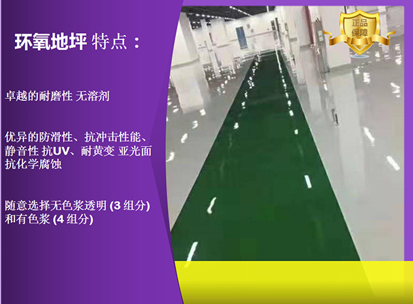 卓越的耐磨性 无溶剂 优异的防滑性、抗冲击性能、静音性 抗UV、耐黄变 亚光面 抗化学腐蚀 随意选择无色浆透明 (3 组分) 和有色浆 (4 组分)
